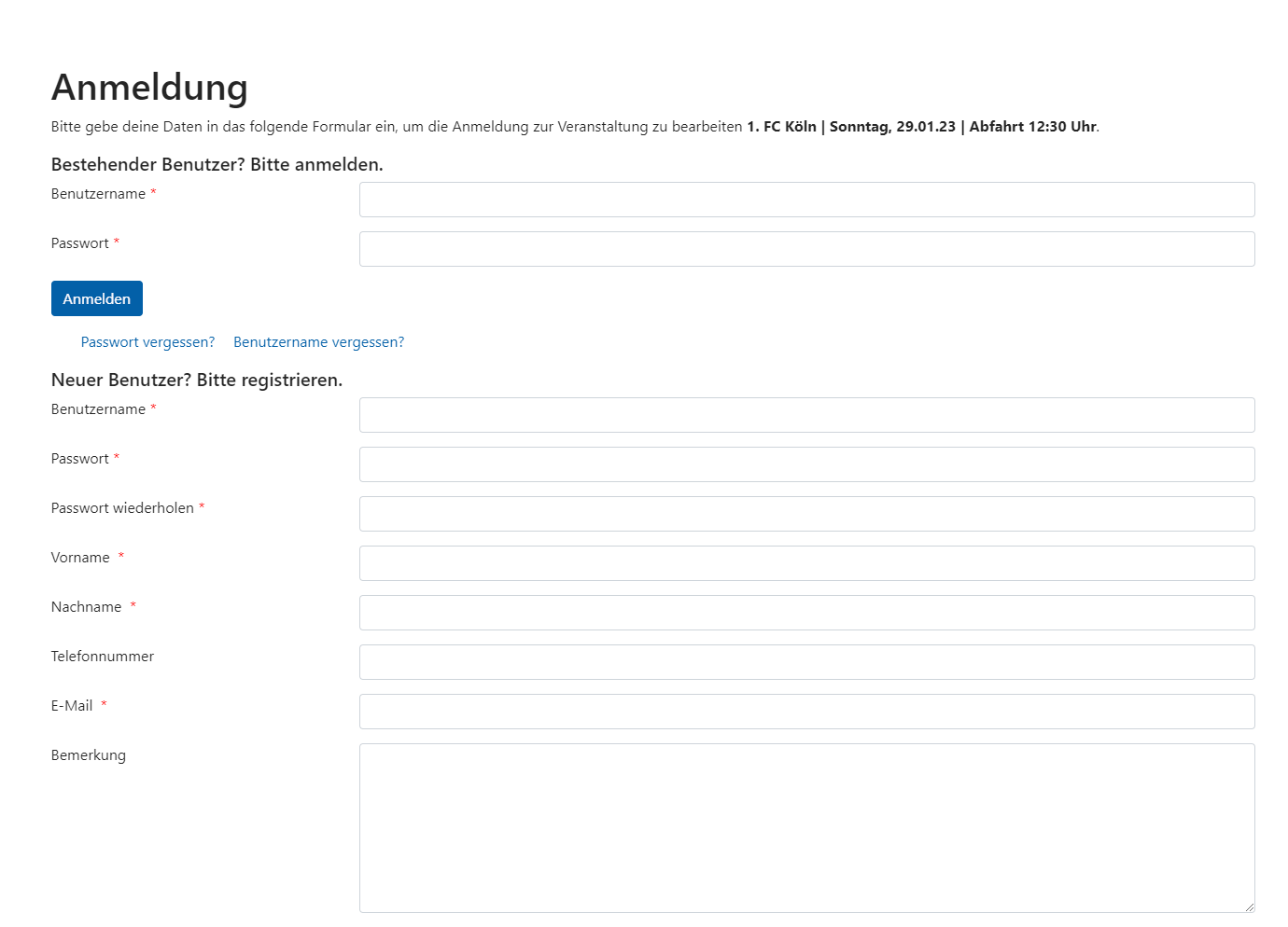 Wenn ihr euch das erste Mail im neuen System für eine Busfahrt anmeldet, müsst ihr euch registrieren. Bitte merkt euch euren Benutzernamen sowie das Kennwort für weitere Anmeldungen. Über die Schaltflächen Passwort vergessen sowie Benutzername vergessen könnt ihr euch diese aber auch wieder schicken lassen.